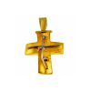 Γυναικείος, χειροποίητος, δίχρωμος, γυαλιστερός σταυρός 14 καρατίων με συνθετικές πέτρες. Κατασκευασμένος από 2 επίπεδα χρυσού, καλύπτοντας την επιθυμία για μοντέρνα εμφάνιση. Σχεδιασμένος με ακανόνιστες γραμμές, στην επιφάνεια του, που του προσδίδουν μια ιδιαίτερη, μοντέρνα εμφάνιση.